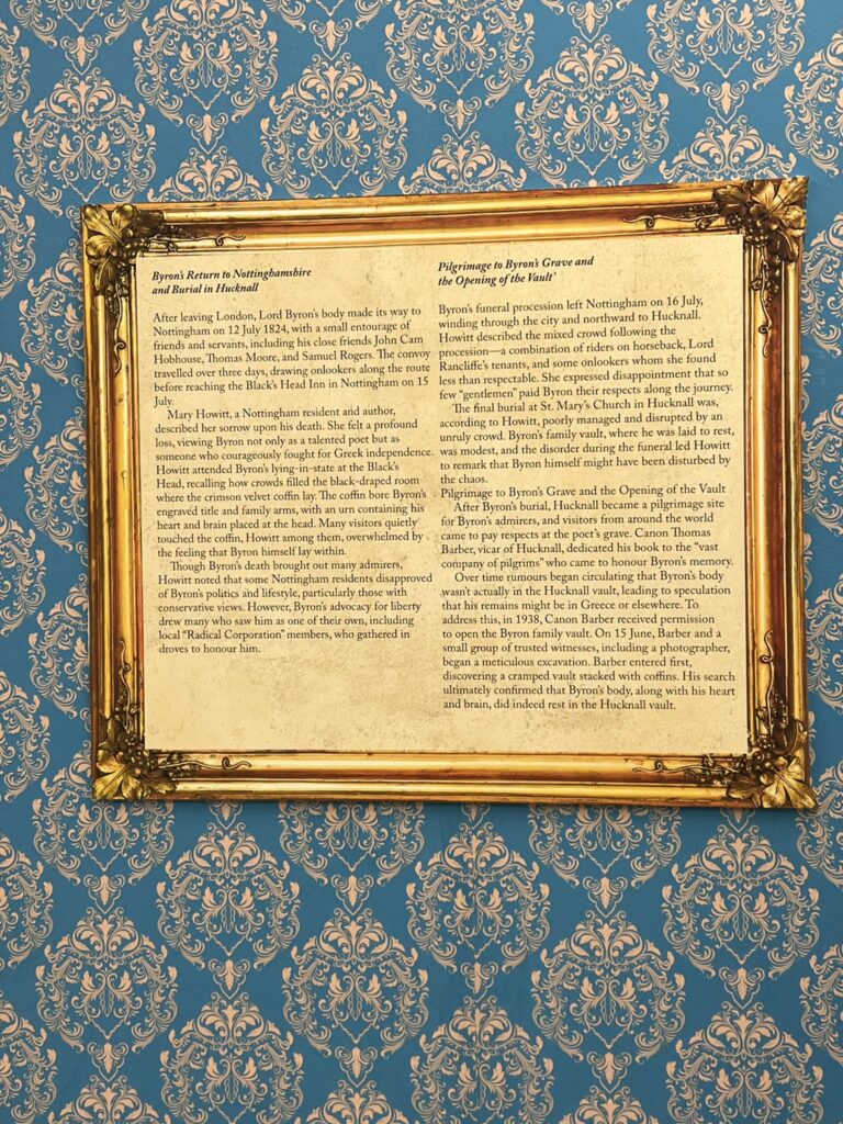 At the Central Library, we visited the exhibition “Byron’s Final Journey: From Greece to Hucknall”, which poignantly reveals the final days of Lord Byron in Greece. Through artifacts and narratives, we learned about the events surrounding his death in 1824 in Missolonghi, the long journey of his remains back to England, and his burial at St. Mary’s Church in Hucknall.