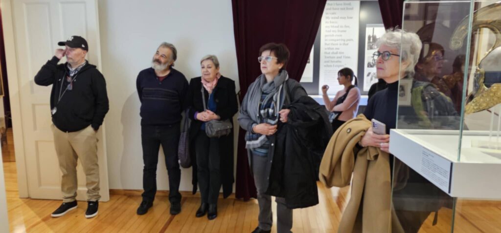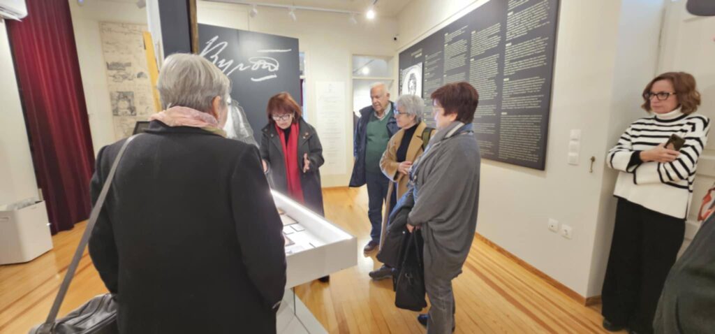 Η Πρόεδρος της ΒΕΜ Ροδάνθη -Ρόζα Φλώρου υποδέχθηκε και ξενάγησε τους επισκέπτες,- Θεοδώρα Πετανίδου, ομότιμη καθηγήτρια Οικολογίας & Οικογεωγραφίας του Πανεπιστημίου Αιγαίου, Παντελή Μπουκάλα, δημοσιογράφο και συγγραφέα, Σπύρο Μοσχονά, Ιστορικό Τέχνης, Βούλα Σπίνουλα Φιλόλογο, Μιχάλη Καλογεράκη Φιλόλογο, Γεωργία Ματσούκα, Προϊσταμένη ΚΠΕ Σικυωνίων Κορινθίας και Σταυρούλα Πολονύφη, συντηρήτρια έργων τέχνης,- στο Μουσείο και την Βιβλιοθήκη της ΒΕΜ, που είναι αφιερωμένα στον Λόρδο Βύρωνα και τον Φιλελληνισμό.