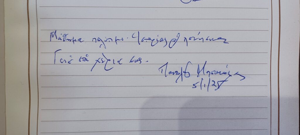 Την Κυριακή 5 Ιανουαρίου 2025, επισκέφθηκαν την Βυρωνική Εταιρεία Ιεράς Πόλεως Μεσολογγίου μαζί με την Προϊσταμένη του Κέντρου Περιβαλλοντικής Εκπαίδευσης κα. Όλγα Γιαννακογεώργου, εκλεκτοί καλεσμένοι στην εκδήλωση παρουσίασης του βιβλίου της, το προηγούμενο βράδυ, με θέμα: “ΑΛΥΚΕΣ ΜΕΣΟΛΟΓΓΙΟΥ- Μισή χιλιετία ιστορίας (15ος -20ος αιώνας). Η συγκρότηση της αλοπηγίας στη νεότερη Ελλάδα”.