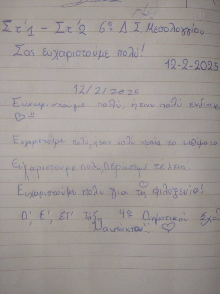 Την Τετάρτη 12 Φεβρουαρίου 2025, το 6ο Δημοτικό Μεσολογγίου και το 4ο Δημοτικό Σχολείο Ναυπάκτου επισκέφθηκαν το Μουσείο και το Ερευνητικό Κέντρο- Βιβλιοθήκη της Βυρωνικής Εταιρείας Ιεράς Πόλεως Μεσολογγίου.