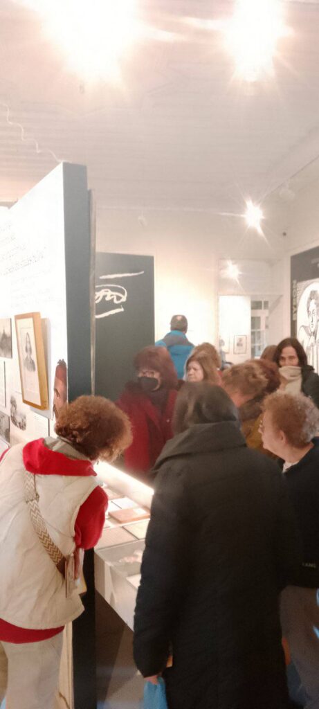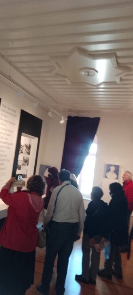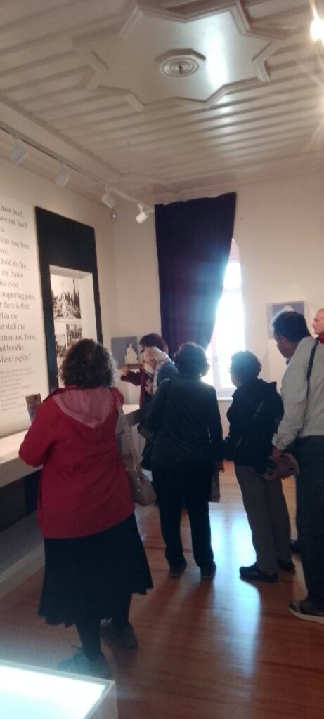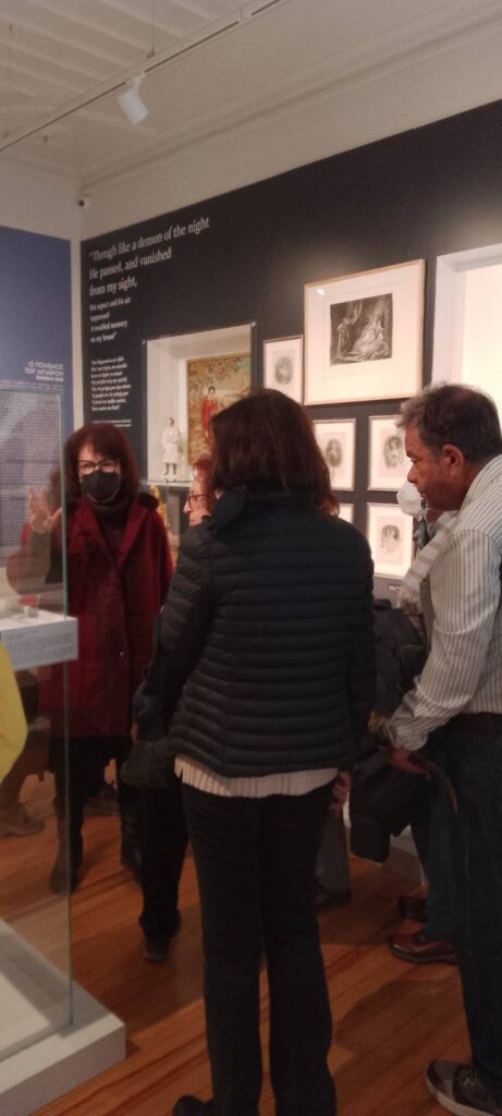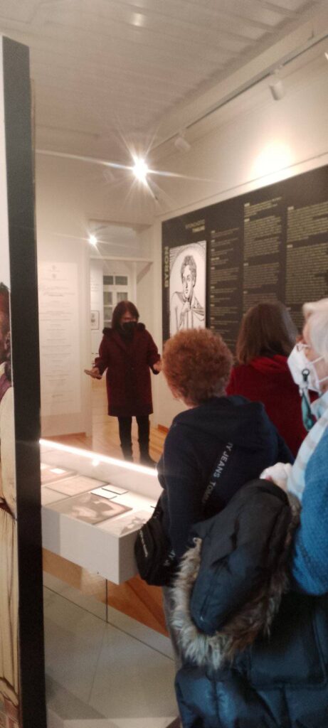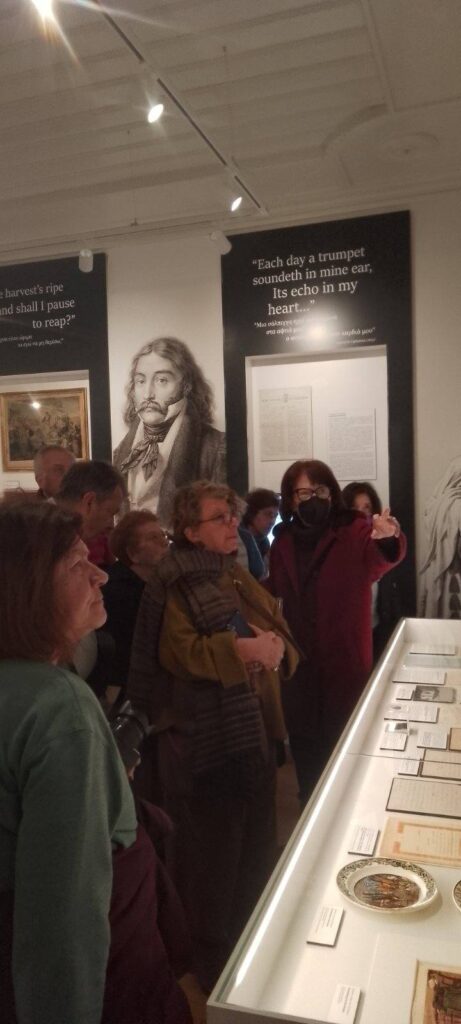 Οι επισκέπτες ξεναγηθήκαν από την Πρόεδρο κα Ροδάνθη Ρόζα Φλώρου, στην έκθεση ” Ο Μπάιρον και η Ελλάδα ” που δημιούργησε το ΕΙΜ και που είναι αφιερωμένη στη ζωή και το ποιητικό έργο του λαμπρού Φιλέλληνα, θαυμάζοντας τα μοναδικά κημείλια.