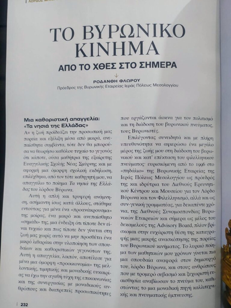 H συμμετοχή της Προέδρου Ροδάνθης Φλώρου της Βυρωνικής Εταιρείας Ιεράς Πόλεως Μεσολογγίου στο αφιέρωμα της εφημερίδας “Η ΚΑΘΗΜΕΡΙΝΗ” με το άρθρο, “ΤΟ ΒΥΡΩΝΙΚΟ ΚΙΝΗΜΑ – ΑΠΟ ΤΟ ΧΘΕΣ ΣΤΟ ΣΗΜΕΡΑ”