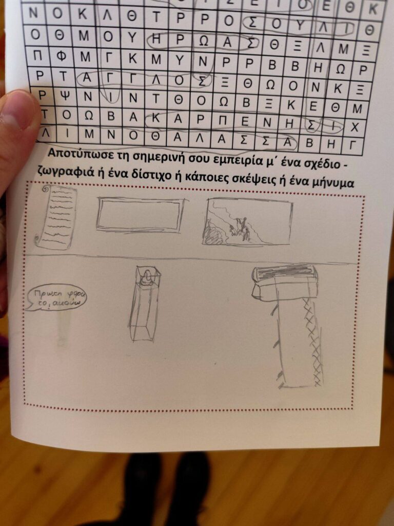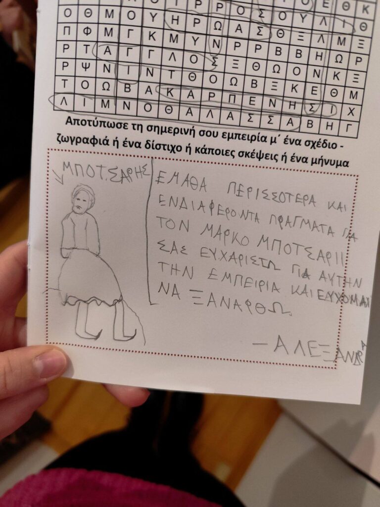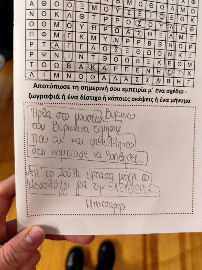 γ. Εμπνεύστηκαν και αποτύπωσαν στο χαρτί με ιδιαίτερο τρόπο τις εντυπώσεις από τη σημερινή μουσειακή εμπειρία τους έχοντας ως μουσική υπόκρουση σχετικά δημοτικά τραγούδια.