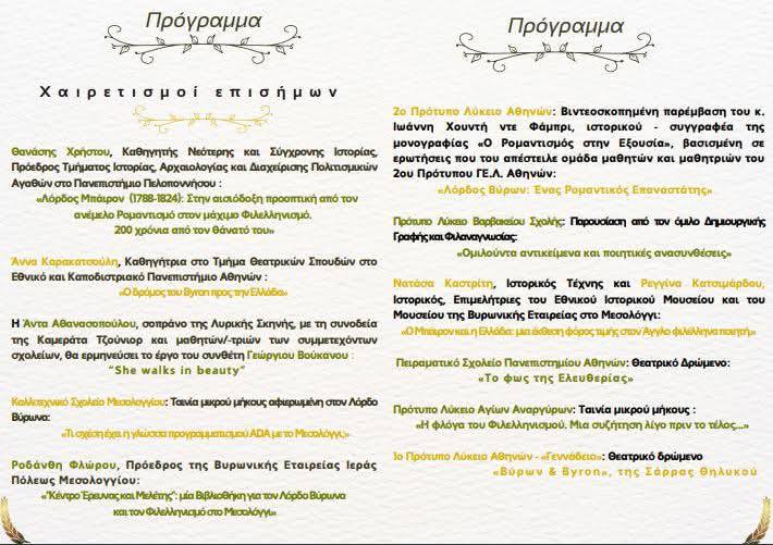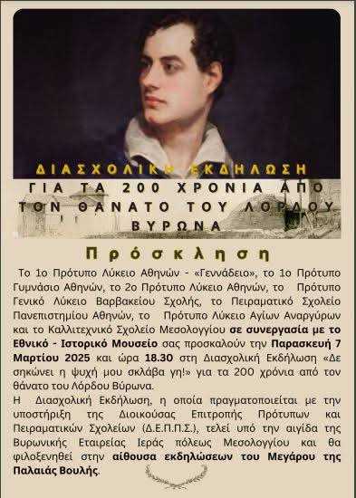 Πρότυπο Λύκειο Αθηνών, το Πρότυπο Γενικό Λύκειο Βαρβακείου Σχολής, το Πειραματικό Σχολείο Πανεπιστημίου Αθηνών, το Πρότυπο Λύκειο Αγίων Αναργύρων σε συνεργασία με το Εθνικό – Ιστορικό Μουσείο ανακοινώνουν τη διοργάνωση Διασχολικής Εκδήλωσης αφιερωμένης στα 200 χρόνια από τον θάνατο του Λόρδου Βύρωνα,με τίτλο «Δε σηκώνει η ψυχή μου σκλάβα γη!».