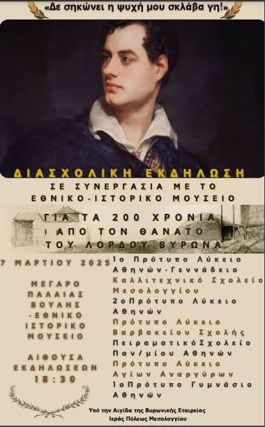 Υπό την ΑΙΓΙΔΑ της ΒΥΡΩΝΙΚΗΣ ΕΤΑΙΡΕΙΑΣ Ιεράς Πόλεως Μεσολογγίου η Διασχολική Εκδήλωση για τα 200 Χρόνια από τον θάνατο του λόρδου Βύρωνα με θέμα: «Δε σηκώνει η ψυχή μου σκλάβα γη!» ΠΑΡΑΣΚΕΥΗ 7 ΜΑΡΤΙΟΥ 2025 και ΩΡΑ 18.30 στην αίθουσα εκδηλώσεων του Μεγάρου της Παλαιάς Βουλής.